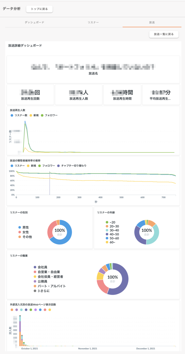 それでも足りない人のためにリスナータブ・放送タブを用意し、放送詳細ではどの離脱しているか?・どこからリスナーが来ているのか?などまで詳細に分かるようにしていきました。